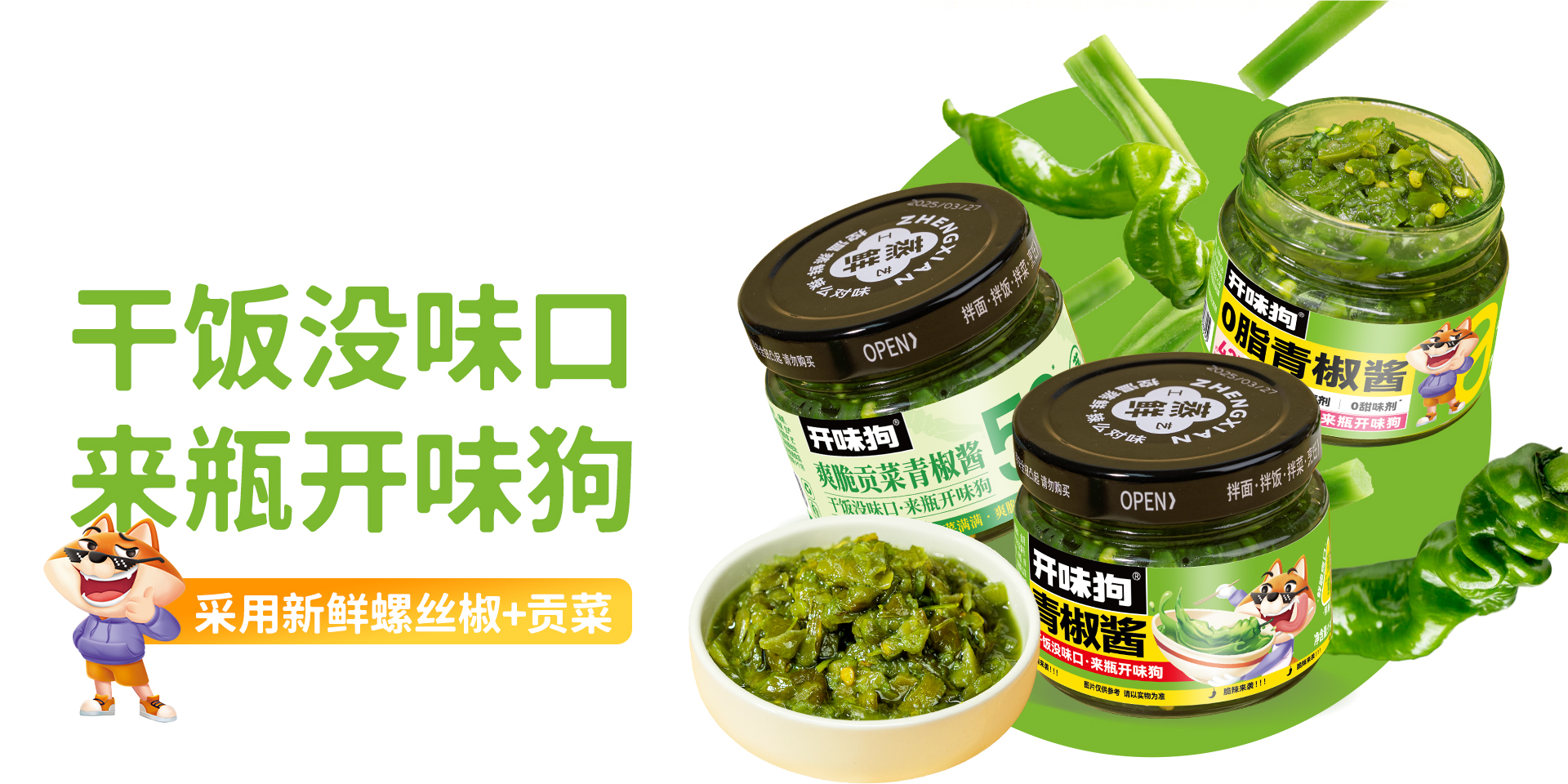 开味狗酱系列以青椒酱、鲜椒酱为核心,依托自有种植基地的优质原料和创新蒸鲜工艺,主打"真材实料、新鲜健康、口感丰富",适配多种食用场景,涵盖两大系列、多款产品。